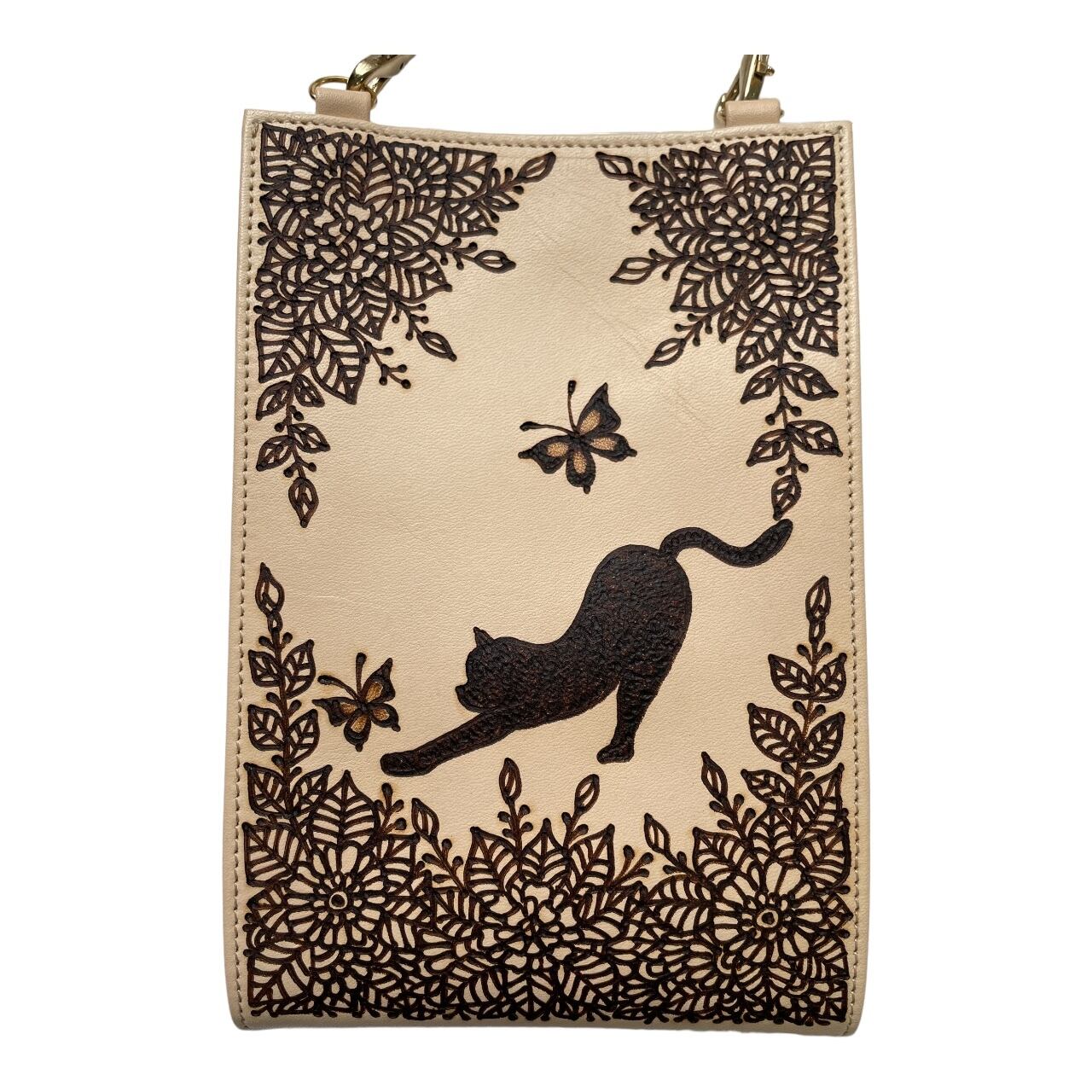 軽量で使いやすく、大人女性にぴったりな小ぶりなサイズ感です。手描き一点物の線画が個性的で、シンプルなコーディネートでもポシェットがアクセントに。独自性を求めるこだわり派の方にお勧めです。手作業による一点物だからこそ、その存在感と使いやすさを追求し、お客様に実感していただけるよう努めました。アメ色に変化する革の味わい深さを、末永くお楽しみいただける商品です。