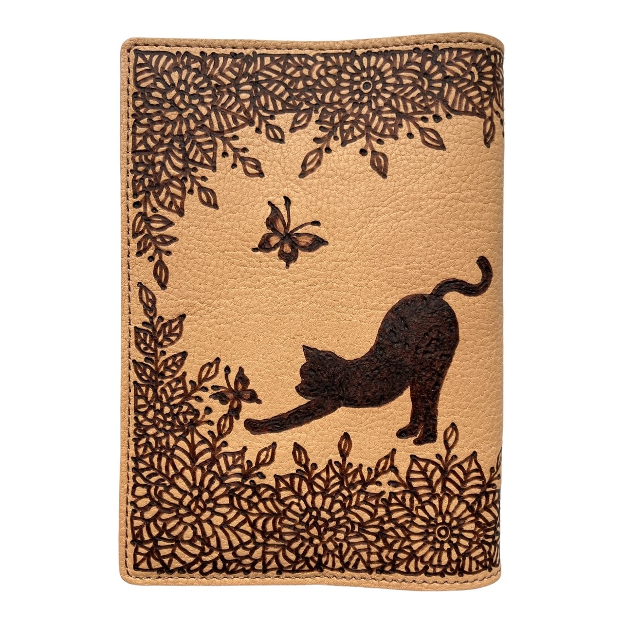 BOOKカバー、手帳カバー、ノートカバーとしてお使いください。(文庫本サイズもしくはA6サイズ)軽量で使いやすく、お仕事やプライベートで持ち歩きにも便利なサイズ感。大人女性のための特別な一品。手描き一点物の線画が個性的で、日々使う小物アイテムを日常のアクセントに。独自性を求めるこだわり派の方にお勧めです。手作業による一点物だからこそ、その存在感と使いやすさを追求し、お客様に実感していただけるよう努めました。アメ色に変化する革の味わい深さを、末永くお楽しみいただける商品です。